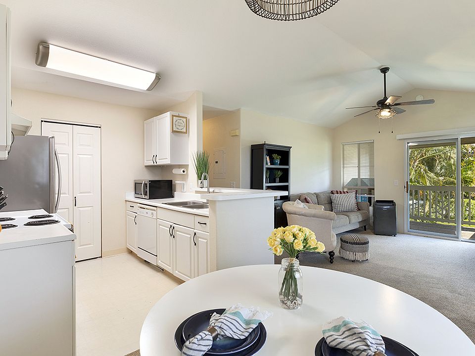 Nestled along the South edge of Ali'i Lani, this upper floor end unit offers peekaboo ocean views from the front lanai and a private park like path from the conveniently located parking spots. And yes, M204 does come with 2 deeded parking spots! A few features include a brand new washer and dryer, new lighting fixtures and fans as well as a large lanai with beautiful mountain views. The layout of this unit and vaulted ceilings in the kitchen/dining/living room help to make M204 feel large and open.