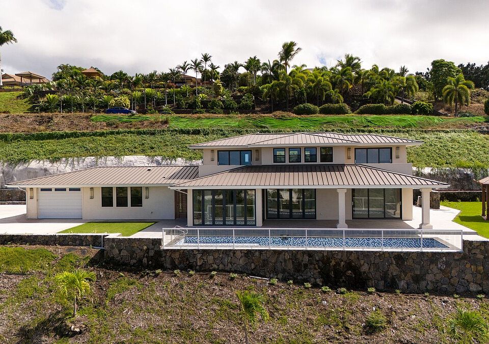 Brand new construction in Kahakai Estates!<br>Nestled at the end of a quiet cul-de-sac within this gated community, this thoughtfully designed two-story home sits on a 1.02-acre lot and offers sweeping Pacific Ocean views. With over 3,274 sqft of interior living space, the residence features 4 bedrooms, 4.5 bathrooms, and a spacious office with frosted glass doors for privacy.<br>The layout includes two primary suites—one on each level—both with custom large closets and luxurious bathrooms. The ground-floor suite also boasts a private outdoor shower, while two upstairs bedrooms open onto private lanais. A wide upstairs hallway provides flexible-use space, perfect for an additional lounge, play area, or reading nook.<br>At the heart of the home, the open-concept kitchen is appointed with quartz countertops, Thunderstone tile backsplash, and custom cabinetry. It flows into a generous dining area with accordion doors that extend to a 408 sqft covered lanai and panoramic ocean views. Just off the main living area, a spacious laundry room offers built-in storage and an additional refrigerator, creating both convenience and functionality.<br>The outdoor living spaces are designed for relaxation and entertainment, featuring a 50-ft pool with a Baja shelf and a Balinese-style gazebo that offers a peaceful retreat. A 914 sqft 3-car garage with drive-through access on both sides, split-zoned AC in each bedroom, office, and the main living area, a standing seam snap-lock metal roof, and a solar hot water system complete this modern island home.<br>This home combines luxury finishes, thoughtful design, and resort-style amenities in one of Kona’s most desirable communities. Kahakai Estates also offers homeowners the use of a private 3-acre community park, adding to the appeal of this exceptional property.<br>Conveniently located just minutes from Kona town, beaches, shopping and restaurants. A perfect blend of quality, design, and island living.