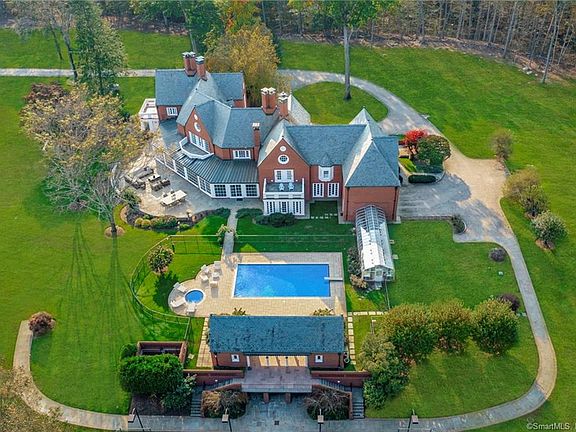 Classic Georgian Estate sited on 11.35 magical acres on New Canaan's coveted West Side. The epitome of privacy, elegance, and modern living, this brick and slate home has it all! Wind down the pastoral drive overlooking manicured grounds and pond views to the main house. Every possible amenity at your disposal including heated pool, spa, pool house, night lit tennis court, greenhouse, Koi pond, and park-like private property nestled behind exquisite electronic gates at the end of a sought after cul-de-sac are just some of the exterior perks. The interior boasts of over 11,000 square ft of main house living with an additional 3,600 of finished space in the lower level. 8 bedrooms, 8 full baths, and 3 half baths are at your disposal with an elevator to help you travel between 4 floors
