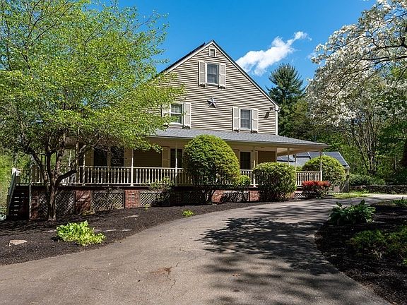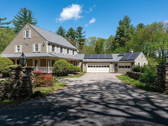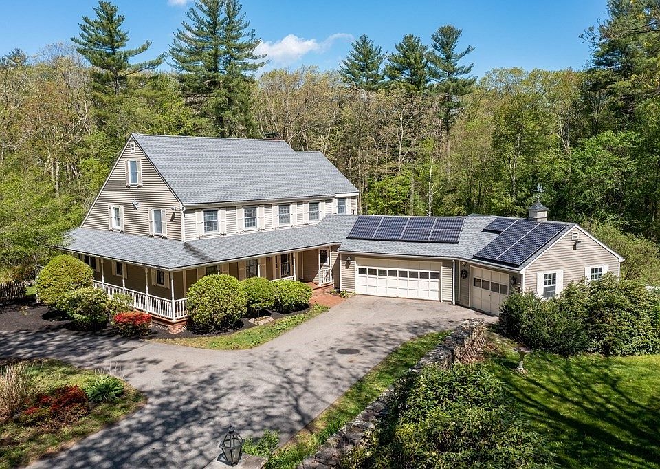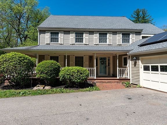 Charming colonial boasting character in a private location. Enjoy a country setting and still be close to major routes. Family room with a quaint brick fireplace and wood stove insert is next to the library which has a sliding door leading to a welcoming wrap around porch. Large Kitchen that includes a wet bar, a breakfast nook and hardwood floors that were recently refinished. Among the 4 bedrooms upstairs is the impressive master suite that is a 2 story loft style bedroom with a balcony, a walk-in closet and bathroom with a shower and soaking tub. Laundry room is conveniently located on the main level. 5 car attached garage and plenty of parking in the driveway. Roof was replaced 5 years ago. Solar panel system has historically produced enough energy to cover the electricity used. Finished basement has a suite and a bonus room currently being used as a workout room.