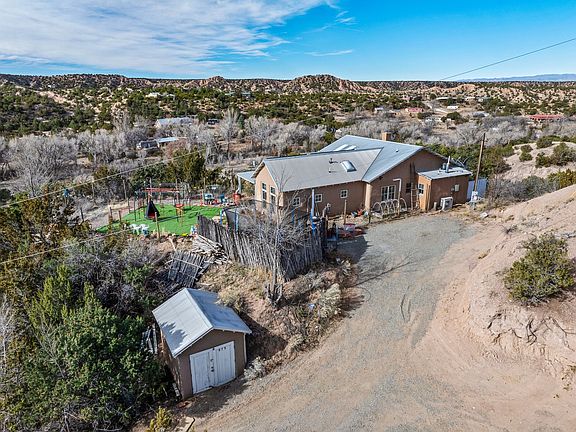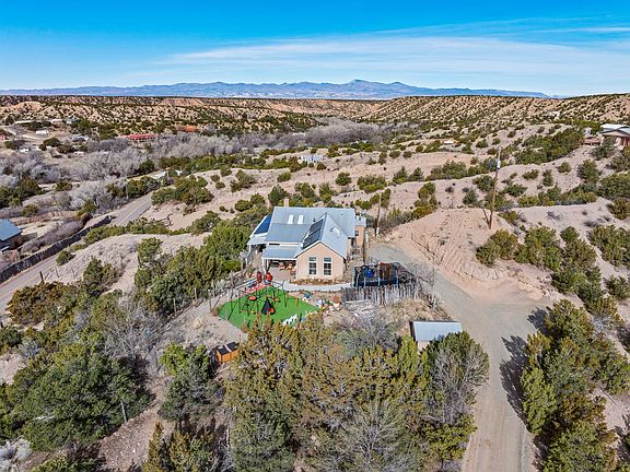Perched amid the enchanting landscape of Chupadero, this rare 2.72-acre sanctuary offers an authentic Northern New Mexican lifestyle with breathtaking views. The adobe main residence (1,500+ sq ft) features curved plaster walls, kiva fireplace, vaulted ceilings with vigas and beams, and flagstone window seals. This 3-bedroom, 2-bath home showcases artisanal craftsmanship. The primary suite includes a walk-in closet and spa-like bathroom with rock shower. The guest bath features a clawfoot tub. Recent upgrades include new appliances, tankless water heater, water filtration system, mini-splits, and solar installation. The property offers an office space and loft area. Outdoor features include multiple portals, a hot tub, artificial turf and a dog run. The second property offers excellent investment potential. Enjoy modern conveniences while surrounded by natural beauty.