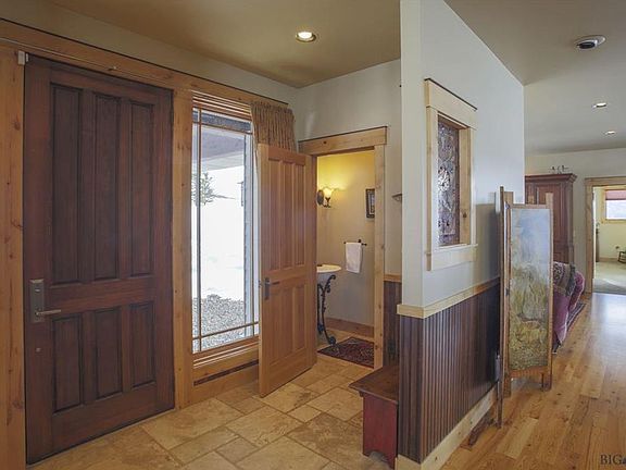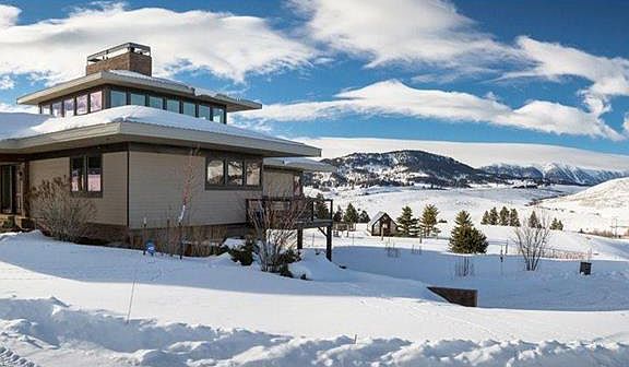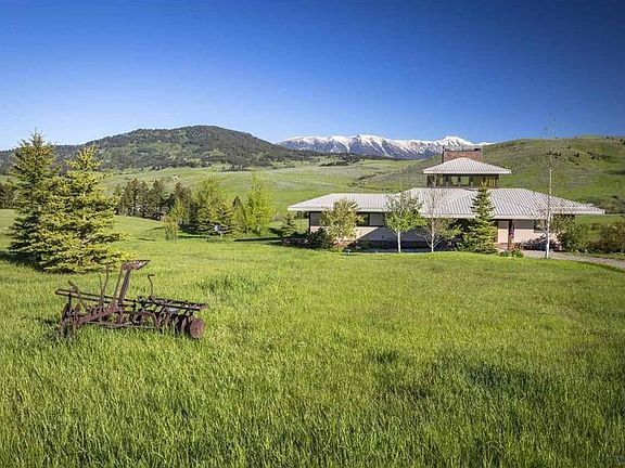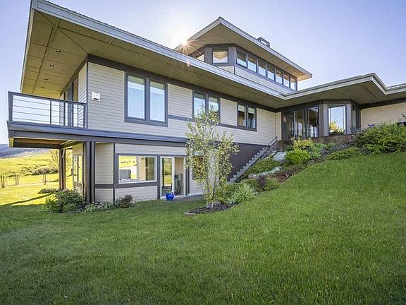 Big panoramic views of Bridger Mountains, Jackson Creek, and Bozeman Pass from this Frank Lloyd Wright inspired, prairie style 3 bedroom home. Designed by renown architect Thomas Bitnar, the home was a 2008 Parade of Homes. Open floor plan with central "Tower" to upper floor office, soaring ceilings, views from every room, wood burning fireplace, main floor Master suite, gourmet kitchen with walk-in pantry, granite counters, 5-burner Thermador range, 2 Junior Suites, library-den, greenhouse, wildlife galore