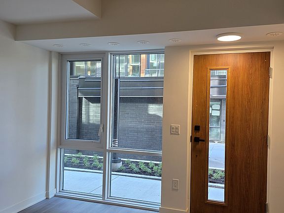 Brand-new, never-lived-in luxury townhouse facing the serene Curlew Drive in the highly desirable Parkwoods community! This contemporary 2-bedroom, 2-bathroom home spans around 800sqft across the ground and second levels, offering an airy open-concept main floor with 9 ft ceilings, wide-plank laminate flooring, and a sleek modern kitchen featuring quartz countertops and stainless-steel appliances. Upstairs, enjoy two bright and spacious bedrooms, including a primary suite with its own ensuite bath, plus a charming wrap-around balcony-perfect. Additional highlights include in-suite laundry, a smart thermostat, video doorbell, underground parking, and a private locker. Built with reinforced concrete, this home provides exceptional durability and superior soundproofing-rare for a townhouse of this style. Located at Lawrence Hill, just minutes from TTC transit, the DVP/401, top-rated schools, parks, cafes, and Shops. A perfect blend of modern comfort and everyday convenience in a peaceful, family-friendly North York enclave. No pets preferred