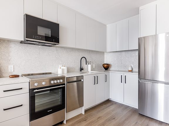 The well-crafted one-bedroom units at Greenpoint Central are bright and airy, featuring oversized windows that fill the space with natural light. The modern kitchen is equipped with custom white grain-matte cabinets, quartz polished countertops, and a matching backsplash. Enjoy top-of-the-line stainless steel appliances and conveniences like a washer and dryer and vented mini-splits for everyday comfort. The spa-inspired bathroom offers a natural vanity with matte black accents, a Yukon Blanco stone vanity top, and contemporary matte black sconce lighting.