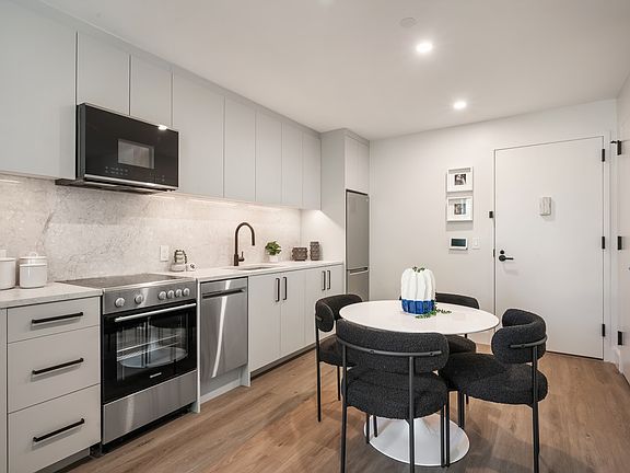 The beautifully designed studios at Greenpoint Central boast oversized windows, a sleek kitchen with custom white grain-matte cabinets, quartz polished countertops and backsplash with stainless steel appliances. Elegant bathrooms offer a natural vanity with matte black hardware, a Yukon Blanco stone vanity top, and stylish matte black sconce lighting. All your modern day conveniences are included such as a washer and dryer, and vented mini-splits and impressive ceiling heights.
