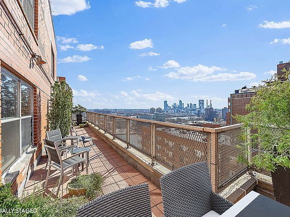 The windowed kitchen, featuring reliable Viking appliances—including two convection ovens and a Miele dishwasher—is ready to shine as a chef’s delight. The adjacent living room opens onto a sizable private terrace that captures views of the East River. This outdoor space, perfect for intimate gatherings or quiet afternoons, is an ideal retreat for those who value outdoor entertaining and the beauty of river views.