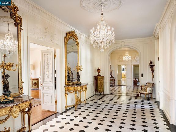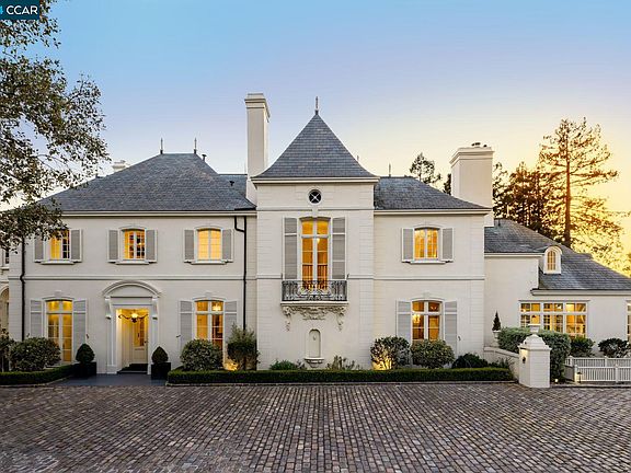 Few homes catch one’s eye like this. The chateau commands views past mature redwoods to SF Bay and The City. Enter through a marble reception hall, under elevated ceilings, into the grand living room. It leads onto a 70’x13’ deck with spectacular views. The dining room could host 30 guests or more. The kitchen offers a butler’s pantry, exceptional appliances, and a dining nook. Four separate offices provide exceptional work/study spaces. Two stairways rise from the entertainment floor to the 4 bedrooms above. The formal circular stairway, with marble flooring and an elegant railing, ascends from the entry hall. A modern hardwood staircase ascends from the kitchen. All bedrooms offer spacious closets, and 3 bedrooms command Bay views. The principal suite, equipped with a wood-burning fireplace, offers particularly grand views and a remodeled bathroom and immense walk-in closet. The laundry room is conveniently adjacent. Continue up another stairway to a professional-quality movie theater. The fun continues on the bottom floor of the home, which can be configured as a ballroom or a place for casual play. The home’s fifth bedroom and exercise room adjoin, and a sport court (now equipped for basketball) sits adjacent to the 3-car garage. This estate exemplifies Piedmont excellence.