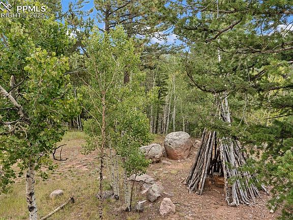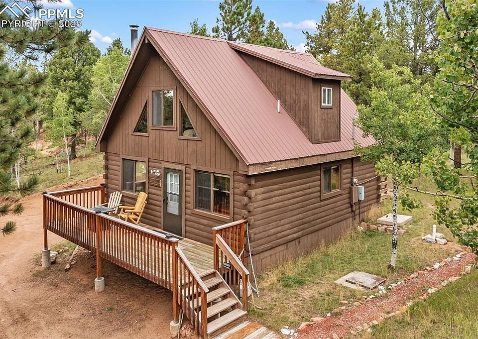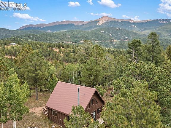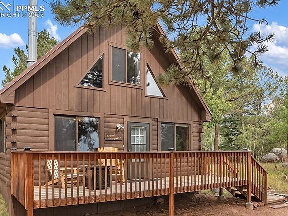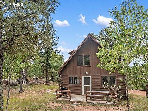 Charming Updated Mountain Cabin in Divide, Colorado. Nestled on 1.47 acres with two combined lots and a vacated lot line, this beautifully updated 3-bed, 2-bath cabin offers the quintessential Colorado lifestyle. Surrounded by mature pines, aspen groves, and striking rock formations, the property showcases stunning year-round scenery—particularly breathtaking in the fall. From the decks and windows, you’ll enjoy sweeping views of Pikes Peak and the surrounding forest. Inside, the home blends rustic mountain charm with modern updates. Log siding, a freestanding wood-burning stove, and hickory cabinetry create a warm, inviting atmosphere, while updated light fixtures and a new washer, dryer, and refrigerator provide everyday convenience. The furnishings are negotiable, making this a true turnkey opportunity. Step outside to relax on the front or back deck, where peace and privacy abound. Two storage sheds add practicality, and the property’s short-term rental history offers excellent investment potential. With its cozy cabin style, modern upgrades, and unmatched views, this Divide retreat is the perfect mountain getaway or full-time residence.