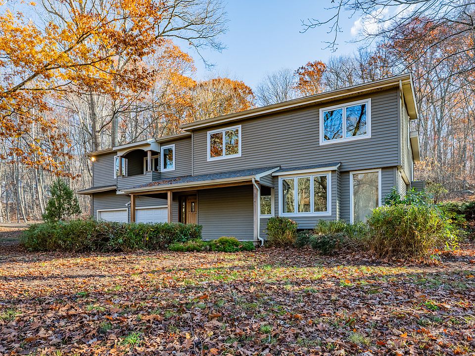 Situated on over 2 acres of private, wooded, park-like grounds, this spacious Split Level home is ready to move in and put your touches on it and make it your own. Upon entrance you'll be greeted by a cozy living room with beautiful stone fireplace and new hardwood floors with large windows that flood the room with natural light. The kitchen offers a breakfast bar and an antique cast iron, wood burning oven built into the chimney providing classic New England charm and opens up to the dining area with large windows and a slider that walks out to the back patio. The upper level offers a spacious office nook with a high ceiling and skylight and a large half bath with laundry that has room to make it a full bath and conveniently leads to the backyard which makes for a convenient mud room. Lastly, on this side of the home is the one of a kind master suite boasting vaulted ceilings, 2 walk-in closets, a large bathroom with stand up shower and jacuzzi tub, and best of all a private, covered porch overlooking the pond in the front yard. On the other side of the home is 2 additional bedrooms with large, double closets and the second full bathroom with plenty of room for a double vanity. New hardwood floors throughout, a brand new roof and plenty more features you won't find anywhere else make this unique home a must see.