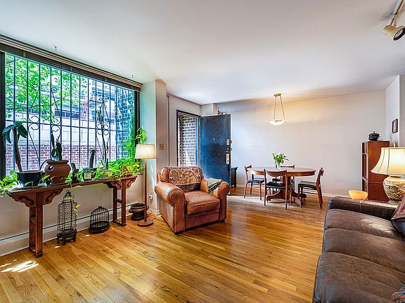 Both the front and rear entrances bring you to the living floor, which features a Living Room overlooking your private landscaped garden, a full sized Dining Room with big windows overlooking the plaza, a windowed Kitchen and a Powder Room. The extra width of this building provides for a nice wide hallway front to back, with a big closet, and presents opportunities for expanding or opening up the kitchen to the front or rear rooms.