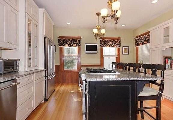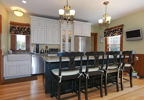 - Kit Dscrp: Dining Area, Flooring - Hardwood, Countertops - Stone/Granite/Solid, Cabinets - Upgraded, Kitchen Island, Stainless Steel Appliances, Recessed Lighting, Remodeled, Cable Hookup, Wainscoting, Gas Stove