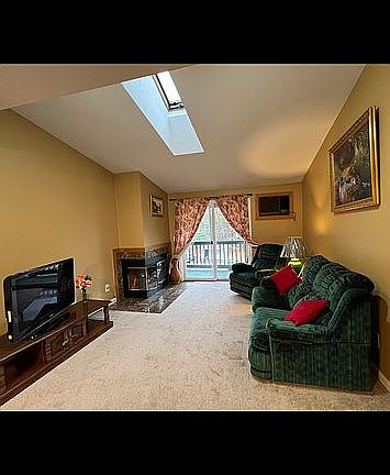 This bright and spacious 2 bedroom,, 1 bath condo is officially for sale. Open concept living/dining area which features a skylight, vaulted ceiling and a cozy electric fireplace. Living room leads out through a slider onto a private balcony. The kitchen has lots of cabinets and plenty of counter space, including a kitchen nook. Bedrooms are spacious with large closets and w/w. Heat is electric with baseboards. Washer dryer hook ups are in the condo. One deeded off street parking space with many visitor spots.