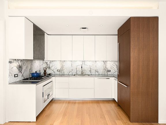 The chef's kitchen is both functional and stylish, appointed with Gaggenau appliances, a marble backsplash and countertops, matte-white cabinetry, and an integrated oak-paneled refrigerator.