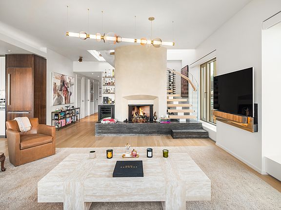 Enjoy fabulous views through floor-to-celling windows overlooking the trees of a serene park. Sweeping views of NYC from Chrysler to World Trade. The living room is centered around a dramatic gas fireplace wrapped in Venetian Plaster with custom limewash. The fireplace has a glass enclosed staircase leading to private terrace.