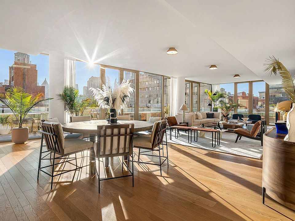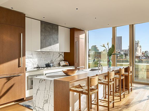 Presenting Penthouse A: The One and Only Four-Bedroom Penthouse Residence at Andre Kikoski & Kravitz Design’s NoLita Masterpiece. Immediate Occupancy at Downtown Manhattan's best selling New Development, Final Residences Remain. Offering limited appointments and 50% off parking for 10 years for select purchasers. Staged in collaboration with Ligne Roset & Modernist Cuisine Gallery, PHA offers the best of indoor and outdoor living in Downtown Manhattan. Spanning over 3,017 SQFT with an additional 2,275 SQFT of exterior living across a private terrace and roof deck, this unparalleled four bedroom, four-and-one-half bathroom penthouse is truly the best NoLita has to offer. Upon entry, stunning white oak hardwood floors lend way to the 45' long great room, with a curtain wall of floor-to-ceiling windows offering exceptional city views and abundant natural light. The open concept living and dining wing boasts a board-form concrete surround fireplace, stunning white oak floors and a curtain wall of floor-to-ceiling windows. Just outside, the first of two private outdoor spaces awaits with a 1,170 SQFT private corner terrace overlooking Downtown. The well-appointed kitchen suits any level chef, fully outfitted with a suite of Gaggenau appliances, marble floating island with a custom oak bar top accented by a rear pewter topped counter, marble backsplash, matte-white cabinetry and two integrated oak paneled refrigerators. Just behind the kitchen you'll find a 6' x 5' pantry for all your cooking essentials, and adjacent staircase leading up to the private 1,105 SQFT sun deck sun deck equipped with a BBQ grill. On the other side of the kitchen, a large laundry room with LG washer and dryer included provides convenient space for storage. Adjacent to the foyer, a jeweled powder room with a custom elm floating vanity with Bianco drama marble countertop and sink complements the backlit, illuminated satin nickel framed mirror and Charleston grey crackle glazed ceramic tiled walls and honed Bianco drama marble floor in custom hexagonal pattern. The bedroom wing provides privacy and tranquility, concluding with the elegant primary suite filled with light and direct access to the private terrace. Offering three closets, one a 9′ × 6.6′ WIC, the adjacent en-suite, five fixture primary bathroom features floor to ceiling windows and exceptional views. Details include a freestanding Devon&Devon tub, frameless glass enclosed shower surrounded by French Vanilla marble and titanium Travertine walls and radiant heated floors, a custom elm floating dual vanity with Bianco drama marble countertop, and sinks with brushed-nickel fixtures and a dramatic custom backlit satin bronze and nickel framed mirror. The three en-suite secondary baths feature either a frameless glass enclosed shower or a soaking tub; all are sleek retreats finished with honed Pompeii Basalt floors, Bianco drama marble walls and a custom designed elm vanity, Bianco drama marble countertop and sink accented with satin nickel fixtures and an artfully crafted backlit satin nickel mirror. The curated collection of 1-4BR residences at 75 Kenmare, born out of the collective vision of Lenny Kravitz’s design firm, Kravitz Design, architect Andre Kikoski and developer DHA Capital, introduces the new look of luxury in heart of downtown Manhattan. An array of amenities are offered including a 24-hour attended lobby, landscaped courtyard, rooftop terrace, state-of-the art fitness center, bike storage & underground automated parking garage. All of this in the heart of NoLita, a uniquely enigmatic and artistically charged neighborhood perched at the intersection of four distinct cultural epicenters: SoHo, NoHo, the Lower East Side and Little Italy. The complete offering terms are in an offering plan available from the Sponsor. NY State Department of Law File No. CD16-0113. Sponsor: Kenmare and Mulberry Associates LLC: 75 Kenmare Street, New York, NY 10012. Equal Housing Opportunity.
