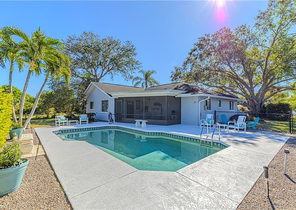 3 Bed/2 Bath, 2 Car Gar/Pool Home. Located on a cul-de-sac with two beautiful oak trees in the front yard. Large oversized pie shaped lot. Long driveway with room for lots of vehicles. Granite counter tops, large open kitchen with newer appliances. Large pool with outside shower. This home has lots of upgrades and updating: New roof in 2018, A/C in 2023, New Fence in 2020, New Master Suite in 2022, New Carpet in Master Bedroom and one Guest Room in 2022, New gutters in 2019 and New Screen in 2024. Top-rated schools, local parks, and Naples' famous beaches, making it an ideal place to call home. Willoughby Acres has NO HOA fees.