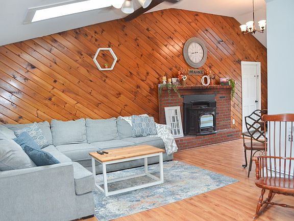 Step inside to a spacious living room featuring a cozy pellet stove insert—perfect for Maine winters. The kitchen offers ample cabinet space, a pantry, and a unique live-edge breakfast bar, flowing into a dedicated dining room for easy entertaining, being used as a bedroom at this time. First-floor laundry adds everyday convenience.