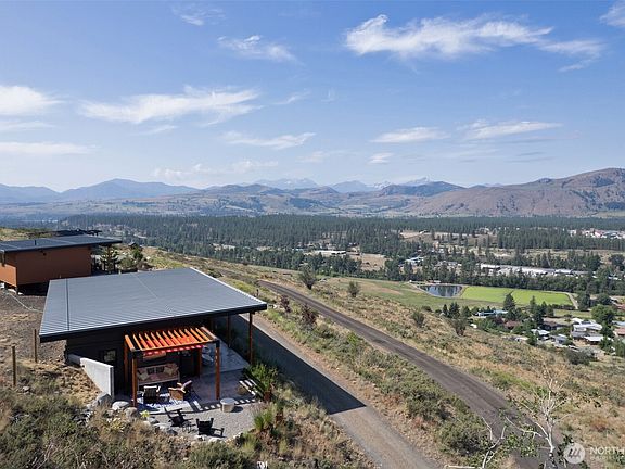 Escape to luxurious contemporary home on Studhorse Mnt capturing breathtaking, unobstructed views of the Cascades, Sawtooths, Pasaytens, & majestic Mount Gardener. 1BD/2BA, den/office retreat showcases a gourmet kitchen w/premium appliances, lofty 12-foot ceilings, dramatic walls of glass & sliders that dissolve the boundary between inside & out. Radiant floors, Solar, mini splits & bermed = ultimate heat/cool efficiency. Step onto expansive private decks to watch sunsets ignite the sky & wildlife roam the property. A detached garage with guest studio above offers the perfect haven for visitors or a remote workspace. Direct access to 139 acres of the Meadowlark Trail Conservancy invites endless exploration & serenity just outside your door.