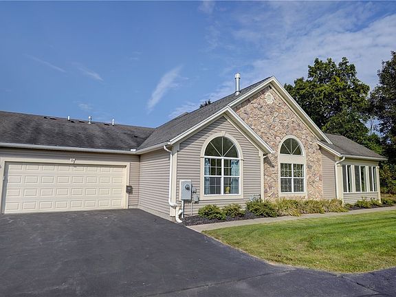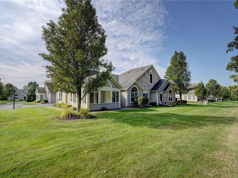 Welcome to a carefree lifestyle! This beautifully maintained ranch-style patio home offers the perfect blend of comfort and convenience. With an open floor plan, cathedral ceilings throughout, and abundant natural light, this inviting space is ideal for both relaxing and entertaining. Enjoy a generous living room, with gas fireplace, that flows seamlessly into the dining area, perfect for gatherings with family and friends. The spacious Kitchen offers ample cabinet & counter space, with a breakfast bar & pantry. The Sunroom, overlooking a wooded backdrop, is the perfect place for morning coffee. Retreat to your private primary bedroom featuring an ensuite bathroom with double vanity & walk-in closet. Guests will enjoy with the 2nd bedroom with adjacent full bath, while the office offers the potential for a 3rd bedroom. Let the HOA take care of all your exterior maintenance, while enjoying access to the community pool & clubhouse! Additional conveniences include: Plenty of closet space, plus a storage room; 2 car attached garage; 1st floor laundry; all appliances included. Negotiations to begin on Wednesday, 9/25 at 12pm.