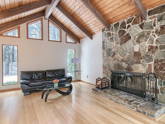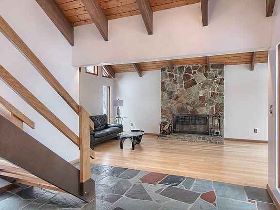 You'll LOVE this home! Fantastic updated contemporary offers open, bright, flowing floorplan for today's living! Enter through the double entry to vaulted foyer w/wall of windows overlooking private 1.5 acres of beautiful grounds. Enjoy the spacious front to back living room w/cathedral beamed ceiling & stone fireplace. Entertain in the generous dining room, updated kitchen w/newer stainless appliances, center island, breakfast area & new bamboo floors. Plush new carpet in the large family room w/3 panel slider to oversized deck is perfect for outdoor relaxing & enjoyment. 2nd level offers 3 bedrooms & 2 full baths. Indulge in the fabulous master suite which includes new upscale luxe bath w/radiant heated floor, oversized deep soaking tub w/relaxation touch controls, skylight & custom walk in closet w/cedar shoe rack. Walkout lower level offers open play area or the perfect game room, storage cabinets, laundry, an exercise/hobby room or possible 4th bedroom. 2 car heated garage. WOW!