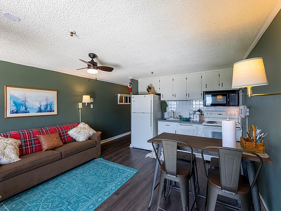 Newly-renovated 1BR/1BA condo located on the top floor of the classic Mountain Lodge with sweeping views of the mountains (sunrise), as well as one of few units to offer a private washer and dryer. Private bedroom, fully stocked kitchen, dining space and a comfortable living room. Brand new hardwood floors, flatscreen smart TVs and new paint, as well as updated light fixtures, ceiling fans and furniture. Spacious balcony coming Summer 2023. Located next to Village and slopes. Ski School located in the basement of the building. Private (gated) parking lot.