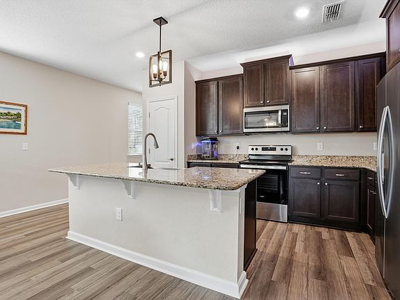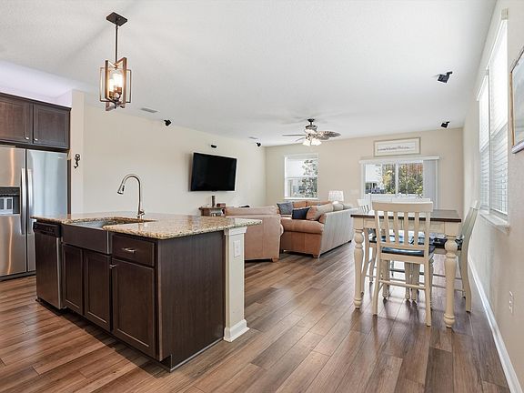 This end unit townhome is just three years young and is positioned at a very affordable price point! Built in 2022, the property provides ample space with a downstairs living area that includes an upgraded kitchen with granite countertops, and 42" rich dark cabinetry with crown molding accents. Easy to maintain vinyl plank flooring encompasses this space as it then flows to the outdoor patio with preserve views. Surround sound speakers are even installed to enhance movie and sports nights or to listen to your favorite tunes. An attached single car garage with a built in work bench and shelving provides plenty of extra storage and a half bath & large storage closet are also located on the first floor. The second floor offers 3 bedrooms (all with end unit windows), 2 full bathrooms, and a convenient laundry closet with built-in shelving. To maximize energy efficiency, the A/C is dual zone to heat or cool only the areas you need. Welcome home to Orchard Park! Not only is the property itself a gem, but shopping, parks, and everything else are just so close! Groceries are only 1 mile away, Treaty Park is right next door, and the beaches and historic area can be reached in 10-20 minutes. The Orchard Park community also offers a dog park and community playground.