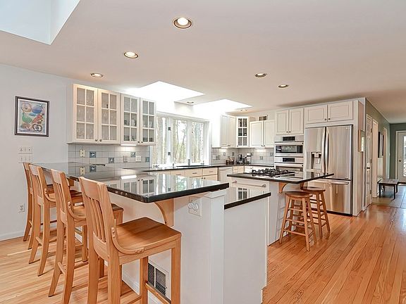 WELCOME TO THIS STUNNING CONTEMPORARY COLONIAL IN PREMIER NEIGHBORHOOD! Lovely winding driveway leads to the beautiful covered front porch. Expansive front hallway leads to open concept living w/ front to back living room, dining room and kitchen. Plenty of white cabinets, granite counters and ss appliances w/work space. Current formal dining room being used as additional sitting room or your future home office. Pretty half bath w/laundry and two car garage complete the main level. Second level features, three spacious bedrooms and main suite w/beautiful main bath. Enjoy the partial water views and light coming in from the huge palladium window on the second level which overlooks the first floor. Updates within the last 2-5 years include the guest bath, water heater, exterior paint, first floor paint, last 5-8 years include deck, patio, master bathroom, and skylights.Heating system was installed 4 months ago.Partially finished lower level w/family room and so much storage!