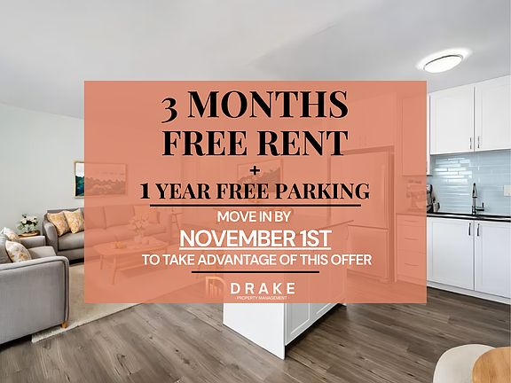 - Special offer! 3 MONTHS FREE RENT + 1 YEAR FREE PARKING - Don't miss out on this incredible deal! Offer is valid if you move in on or before November 1st, 2025. Available on select suitesreach out now for more details! * The rent mentioned in advertisements does not reflect the actual legal rent. The rent shown reflects the average monthly amount, incorporating any discounts over the lease period. Please contact leasing for more details. T&C apply*