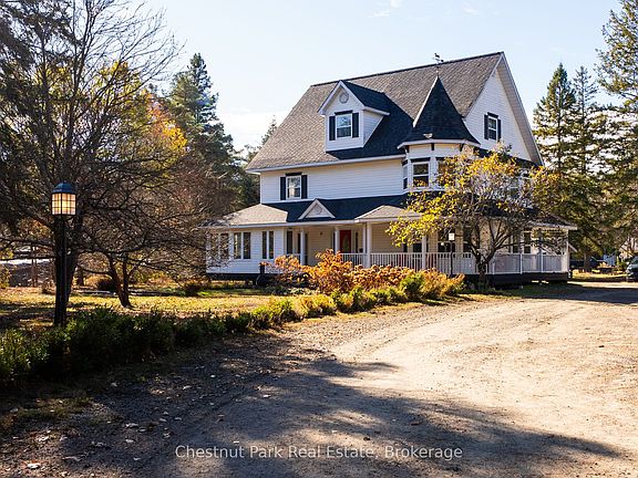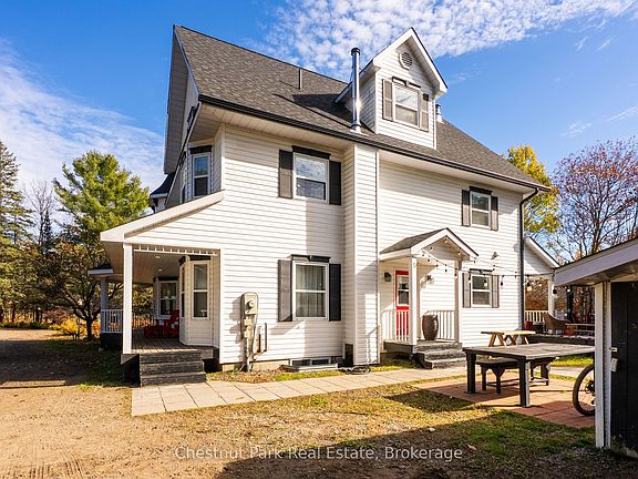 Privately enveloped by mature trees, this spacious and inviting home sits on a beautiful 1.33-acre level lot just minutes outside of Huntsville. Offering over 4,200 sq. ft. of finished living space, this property is designed for comfort, flexibility, and everyday living - ideal for growing families, entertaining, or creating dedicated hobby and work areas. The main level features a warm, functional kitchen with custom cabinetry, granite countertops, a pantry, and a matching hutch with seating that can remain. The adjoining living area offers a cozy electric fireplace, while the bright sunroom is the perfect place to enjoy morning coffee overlooking the backyard. A convenient 2-piece bath completes this level. Upstairs, the primary suite offers a generous sitting area, walk-in closet, and a private ensuite with jetted tub and separate shower. An additional bedroom and a well-designed laundry space with custom cabinetry complete the second floor. The finished third level provides flexible space for a bedroom, studio, playroom, or home office.The lower level features a large, naturally lit recreation room with custom cabinetry, a hobby/storage room, and plenty of space for future personalization. Outside, enjoy evenings under string lights, gather around the fire pit, or cool off in the above-ground pool (approx. 3 years old, sand pump included). The yard is beautifully landscaped with mature evergreens, apple and pear trees, productive grape vines, and a blueberry bush. A wrap-around, fully lit porch and perennial-lined walkways add charm and character. Additional updates include shingles and eavestroughs (2023), owned hot water tank, oil-forced air heating with humidifier, garbage disposal, sunroom window coverings, and outdoor dining table with benches. A peaceful setting with easy access to Huntsville amenities, this home offers space, comfort, and a beautiful natural backdrop.