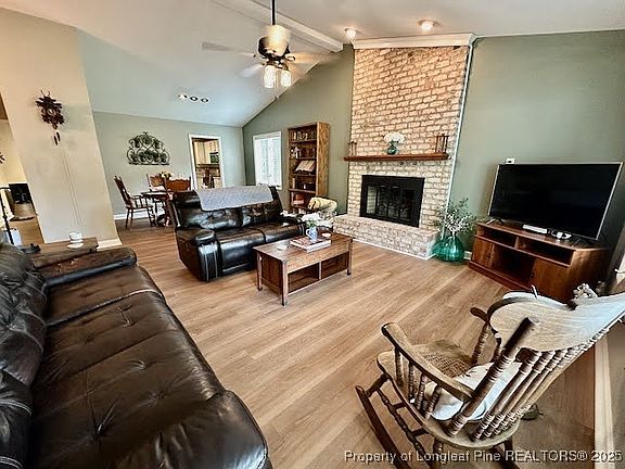 Charming Nantucket-style 3BR/2BA home in the gated lake & golf community of Carolina Lakes! This beautifully updated home features Terrazzo countertops, white cottage cabinets, LVP flooring in main areas, and brand-new carpet in bedrooms. The vaulted living room boasts a floor-to ceiling light brick fireplace and exposed beam. Enjoy the stunning sunroom with a wood-paneled ceiling-perfect for relaxing or entertaining. The master suite offers a light wood accent wall and wainscoting in the bathroom. Outside, enjoy a new deck, fully private backyard with a stone fire-pit, and wooded common area behind the home leading to the lake. Recent updates include exterior wood painted (2022), new deck, roof (2019), new gutters (2021), new carpet and LVP flooring, and light fixtures. Carolina Lakes offers a guarded gate, lake with marina and beach, pool, clubhouse, golf course, trails, courts, parks, and more! Just 15 minutes Fort Bragg. A perfect blend of comfort, charm, and lifestyle- schedule a showing today and fall in love with the lake living.