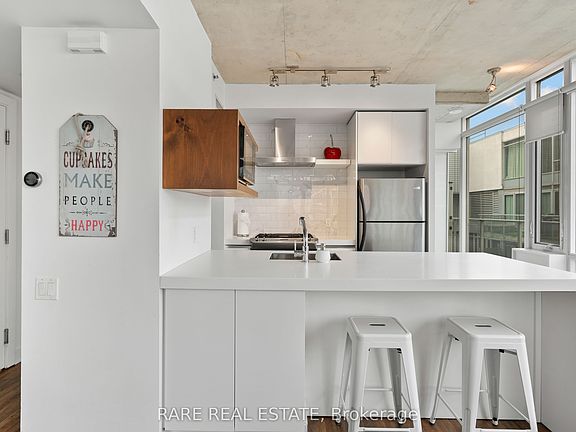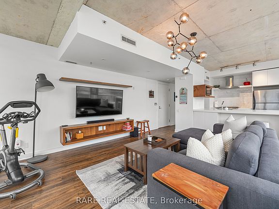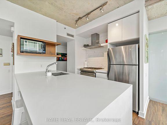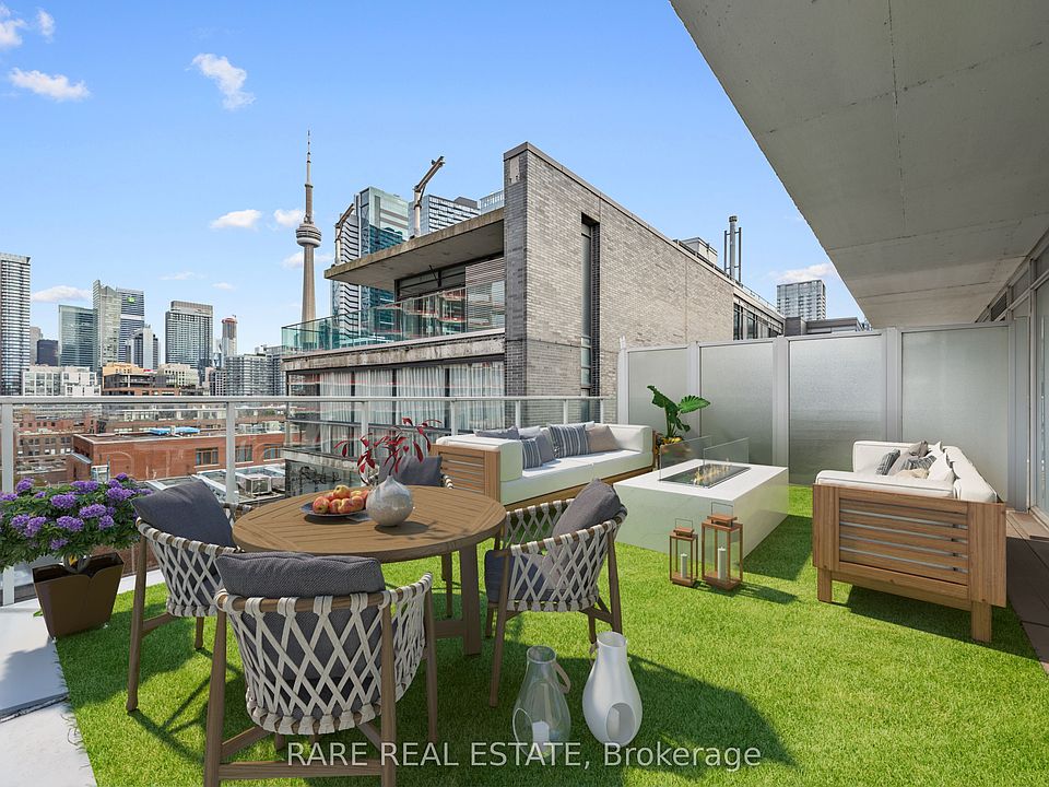 This rare corner sub-penthouse offers an extraordinary opportunity to own a true architectural standout in downtown Toronto. Boasting over $70,000 in high-end upgrades, the suite features fully brand-new LVT flooring, renovated bathrooms with additional storage, and a modern, upgraded kitchen with premium appliances. The open-concept layout is wrapped in floor-to-ceiling windows, flooding the home with natural light, while 9' exposed concrete ceilings and designer lighting create a sophisticated, gallery-like aesthetic ideal for both relaxing and entertaining. Step outside to an incredible 536 sq. ft. wrap-around terrace and balcony, finished with premium artificial turf and equipped with a direct gas line for effortless BBQing. This oversized outdoor space nearly doubles the living area in warmer months, offering a rare blend of indoor-outdoor urban living. Parking and locker are included, and the suite is supported by incredibly low maintenance fees for a condo of this caliber. Located in the heart of Toronto's vibrant King West / Fashion District, this residence provides unmatched access to the city's finest restaurants, cafés, boutique shops, parks, and cultural attractions, including TIFF Bell Lightbox and Victoria Memorial Park. Excellent transit options include the King Street streetcar at your doorstep, a short walk to St. Andrew Subway Station, and easy access to the Gardiner Expressway. With a near-perfect walk score, this home allows for effortless downtown living, work, and play, making it one of the city's most coveted addresses.