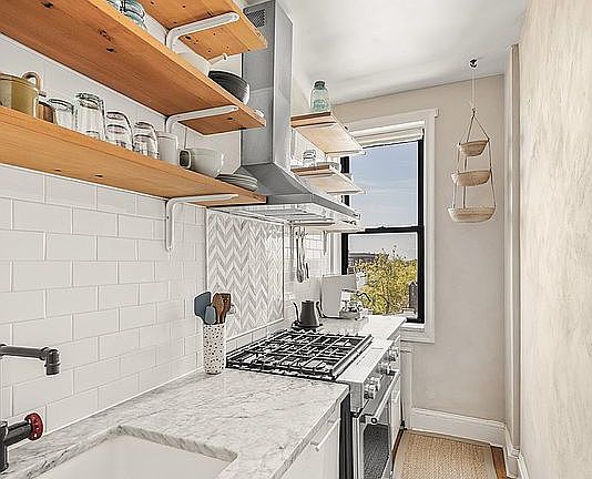 The kitchen features marble counters and high-end appliances including a new Bosch gas range. The Kohler-finished bathroom is complemented by a custom linen closet and storage cabinet.