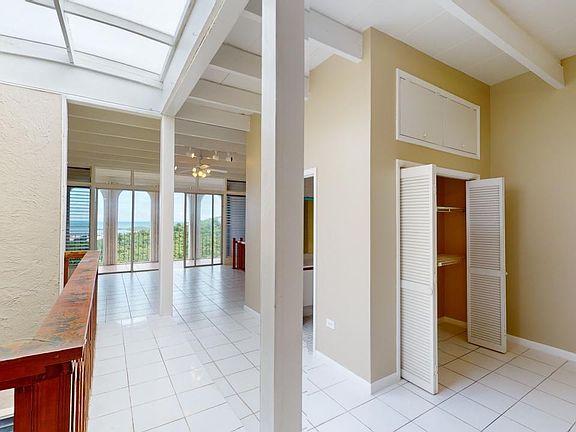This contemporary condo at K 75 Questa Verda offers a generous 1500 sq. ft. of living space across two floors. The lower level spans 820 sq. ft., while the upper floor provides 690 sq. ft. The layout includes two bedrooms, with the primary bedroom offering a spacious 170 sq. ft.. and two and half bathrooms ensuring ample convenience for residents.The interior design features a neutral color palette, predominantly beige and white, creating a bright and airy atmosphere. Tiled flooring runs throughout the property, adding a touch of elegance and easy maintenance. The living areas are particularly noteworthy, with three separate spaces for relaxation and entertainment. High ceilings with exposed white beams add visual interest and a sense of spaciousness, while ceiling fans provide comfort and air circulation.