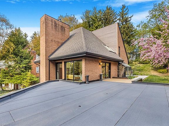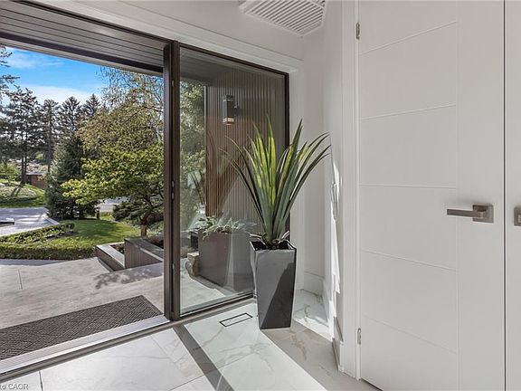 Timeless. One-of-a-Kind. In-Law Suite Perfection. Fully Renovated. Discover this architecturally significant Mid-Century Modern custom-built home by Ancaster architect Bruce Berglund. Blending classic design with a fully updated interior, this 3,400 sq ft residence offers refined living on one of Ancaster’s most prestigious streets, backing onto Fieldcote Memorial Park. The curb appeal is striking—concrete, brick, and floor-to-ceiling glass, with LED-lit steps that make the home glow like a jewel box at night. Inside, soaring ceilings, oversized windows, and skylights flood the space with natural light, creating a seamless connection to the outdoors. The open-concept main floor features a dramatic wood-burning fireplace, a floating staircase, and a chef’s kitchen with high-gloss cabinetry, quartz counters, premium appliances, a wine column, and expansive views. Large sliding doors lead to a private, tree-lined backyard—ideal for entertaining or unwinding. A flexible bonus room on the main level serves perfectly as a home office or guest bedroom. Upstairs, the primary suite boasts vaulted ceilings and a spa-like ensuite. A second bedroom, fully renovated bathroom, and a hallway open to below complete this level, showcasing the home’s striking architecture. The lower level has its own private entrance and functions as a self-contained one-bedroom suite with a kitchenette, updated bath, and spacious living area—ideal for guests, in-laws, or rental income. A double car garage, designed to double as additional patio space, and an oversized updated driveway provide ample parking. Fully renovated inside and out, this home is a rare offering in an unmatched location. Welcome to timeless design and modern comfort.