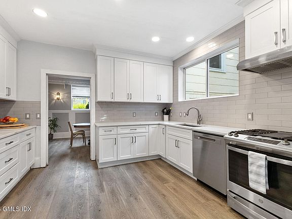 large eat in kitchen with granite counters, new cabinets and stainless steel appliance, dining room, large living room with sliders opens to large patio and yard.