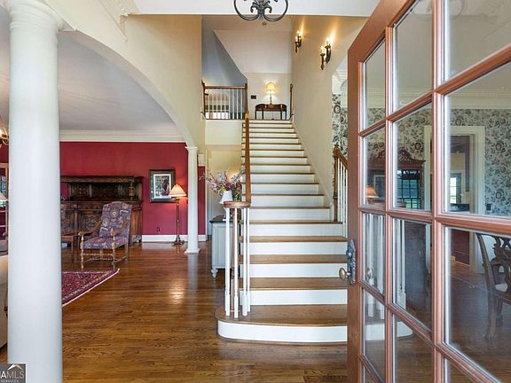 Welcome to 75 Rivercreek Crossing, an elegant riverfront estate home constructed of the highest-grade materials and craftmanship imaginable. Nestled on a private 18.5 acre lot within the highly coveted Riverwood Farms, a prestigious equestrian community along the Etowah River. Receive guests on the large wrap around front porch, a quintessential Southern design staple. Once inside, delight in the soaring two-story foyer flanked by a formal dining room and fireside sitting room. The gourmet kitchen will please any at-home chef with its commercial grade appliances, custom built cabinets, center island, stone countertops and charming overhead beams. A bright keeping room and cheerful breakfast nook complete this space. Currently hosting a baby grand piano, and ideal for a remote home office, the wood-paneled study, is a cozy respite with its crackling fireplace. The main level primary suite is a relaxing retreat boasting a marble-clad dual vanity washroom with a clawfoot tub and large walk-in shower as well as oversized closets with custom built shelving. Two additional secondary bedrooms, each with complete en-suite bathrooms, and a large bonus room encompass the entirety of the second level. Luxury living continues outside with a recently upgraded pool surrounded by extension stone patio leading to party pavilion complete with outdoor chandelier above the Vikings Spa hot tub. Tucked away from the main dwelling, the guest house was designed to emulate a posh hunting lodge featuring vaulted wood ceilings above the open-concept kitchen, dining and living space. Two additional bedrooms, a full bathroom, and additional laundry facilities create the perfect spot for out-of-town guests, or live-in staff options. Horse lovers will be thrilled with the professionally outfitted barn offering three stables, a tack room, storage and hay loft. Ample pastureland is surrounded by an outer wooded fence lined with field fencing and the front pasture uses a solar charged low voltage wire. A climate controlled two-car garage and adjacent two-car carport round out the exterior amenities. Idyllic setting is double gated for the utmost in privacy and security, surrounded by other multi-million dollar homes. This is truly a rare opportunity to own more than 900 feet of river frontage in Bartow County, convenient to Rome, Cartersville and commuting to metro Atlanta. Welcome home to a life of serene luxury at this grand estate home with lush grounds and magical equestrian wonder.