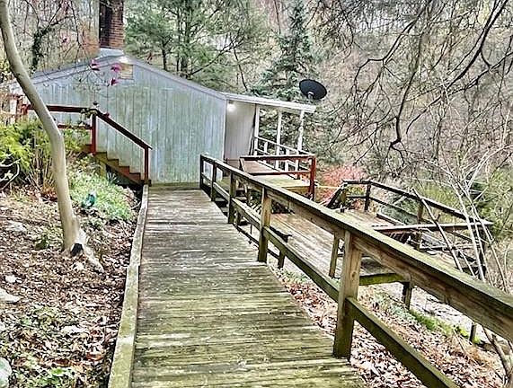 NEW PRICE: Spring is Here and it's Time to Start Enjoying the Outdoors. Looking for a Cabin/Home for either Full-Time Living or a Weekend Getaway, this May Be the ONE! Property is being Sold AS-IS. Bring your Renovation Talents, Skills & Handyman Projects to this dwelling and Make this Your own " Home Sweet Home". The Home Welcomes you with Expansive Decking and a Covered Porch with Views of Flowering Trees and Wildlife and sounds of Birds Chirping on the nicely sized 1.18 acre Lot. The mostly Sloped to the Level portions of the Ground is Terraced with Natural-shaped Limestone Caps, Multiple Varieties of Flowers and Ground-Cover Annuals and Mix of Cedars and Evergreens. This property borders State Owned Land. The home is nearly 800 finished sq ft with a metal Door-entry to dirt floor partial basement/+crawlspace area. The Cabin/Home offers 2-Bedrooms (the second bedroom is currently a Hobby Room). The Desirable Open Concept within the Combined Foyer, Living & Dining Room areas are enhanced by a Wooden Beams & Cathedral Ceiling Design . There is a built-in Brick Fireplace with a Propane Gas Indoor Space Heater on the Hearth, at insert plus Brick Mantel has enough space for your Collectibles. A TV could be mounted on the Wall above the Mantel. The Comfortable Kitchen offers a Dual Stainless Steel Sink with a Window with a View, Gas Stove & a Newer Refrigerator. The built-in Work/Server Center has Additional Storage Space & is a real Plus! One Full Bathroom offers a Low Profile Shower and a Built-in-Wall Heating Unit. Primarily Sliding Vinyl Windows are situated throughout. the Home. A Slider-Door provides Entry / Exit off the Primary Bedroom onto the relaxing Covered Porch. The Primary Bedroom also has Electric Baseboard Heat. The property has a Shared Well + an Individual On-site Septic. which the location has been visibly marked. The Cabin does require work and TLC. The shared well fee is $65.00 per year, paid annually on July 1st. This completes the Cabin/Home Package. The Setting provides Privacy by the Positioning of the Home on the Sprawling LOT. The Driveway is Long enough for Several Parked Vehicles. USE ONLY the WALKWAY with the CONCRETE portion and AFTER Bend becomes the Wooden portion ....CONTINUE onto the COVERED PORCH for the DOORWAY ENTRY. FOLLOW the FLAGS on the property which MARK for the WALKWAYS to Move around the Rocky Grounds more Easily.. PLEASE DO NOT attend showings in Sandals, Flip flops or Open-toed Shoes for these will LIMIT Your Walking Ability while Meandering the Grounds . A HOLD HARMLESS Addendum MUST be Signed by ALL AGENTS and Their CLIENTS and Sent Back to the Listing Agent PRIOR to all Scheduled Showings Appointments. A 4 Hour Notice is Required. BY APPOINTMENT ONLY. Schedule NOW!