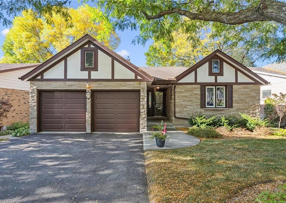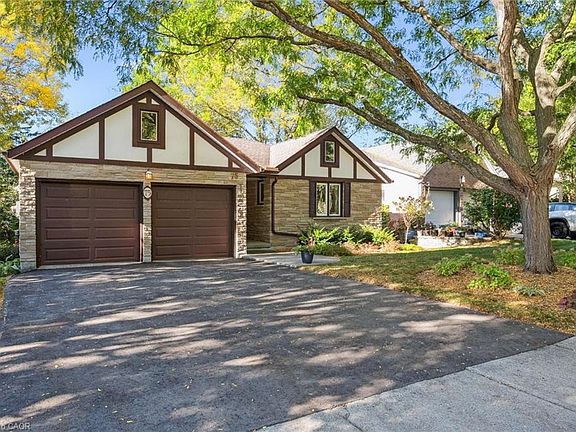 Welcome to 75 Shadybrook Crescent - a charming Tudor-style bungalow nestled in the highly desirable Kortright West neighbourhood, just steps from Preservation Park and its incredible trail system! With over 2,600 sq ft of finished living space, including a walk-out lower level, this 3+1 bedroom, 3-bathroom home offers both character and flexibility for a variety of lifestyles. The main floor features hardwood flooring and an open-concept living and dining area centred around a stunning full-height stone fireplace. Three spacious bedrooms and two full bathrooms make everyday living comfortable and functional. Downstairs, the finished walk-out lower level adds even more opportunity. With a second kitchen, full bathroom, large recreation room with its own fireplace, and a fourth bedroom, it’s an ideal setup for multi-generational living or mortgage helper. Outside, the backyard provides shade and privacy under a canopy of mature trees - perfect for relaxing or outdoor entertaining. An attached garage and double driveway add convenience, and commuting is a breeze with fast access to the Hanlon. Lovingly maintained and move-in ready, this home gives you the flexibility to enjoy it as-is and update at your own pace. Settle in and soak up fall in one of Guelph’s most nature-connected neighbourhoods!