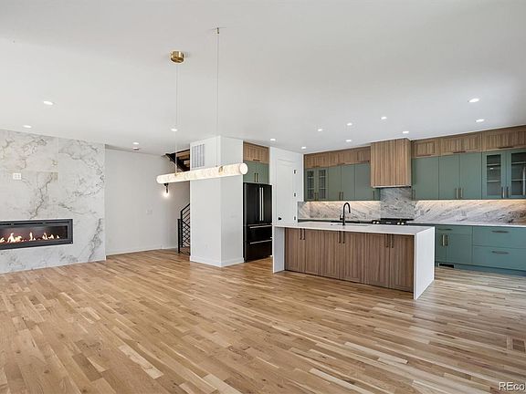 Where contemporary design meets Colorado lifestyle — this home defines elevated urban living. Flowing like a single-family residence, this thoughtfully designed half duplex delivers 3,520 sq ft of sophisticated style. The open-concept main level showcases a designer kitchen with imported stone countertops, moody black-and-gold appliances, walk-in pantry, and sleek slab backsplash. Real hardwood floors set a refined tone while a modern linear fireplace and statement lighting create a warm, inviting space. Every finish feels intentional — blending architectural edge with a softer, designer-curated aesthetic rarely found in new construction. Up the striking steel-and-wood monorail staircase, three of the five bedrooms sit on one level, including a primary suite with a spa-inspired bath featuring heated floors, a fluted soaking tub and dual vanity. The third level offers incredible flexibility with an additional private bedroom, extra-large bonus room, wet bar w beverage fridge, full bath, and rooftop deck. The finished basement impresses with 9-ft ceilings, a spacious recreation room, custom wet bar, and private guest suite with full bath. Outdoor living shines with a large, private backyard with south sun exposure. Direct access to the 2-car garage, EV-ready (220 V). Built to Denver’s newest Green Code, this all-electric home offers lower bills, cleaner air, and superior efficiency. Eco features - EcoBee thermostat, Ring doorbell, WiFi-enabled heat pumps, programmable lighting & fireplace, UV Windows. No HOA. Party Wall Agreement. Buyer to verify taxes & square footage. Schedule your private showing today — exceptional homes like this are rare.