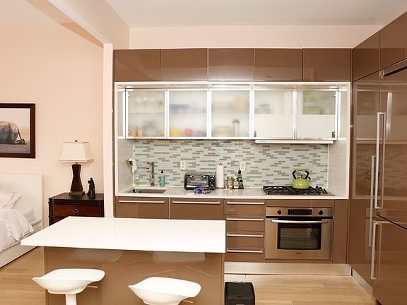 Designed by Rockwell Group, 30Q is a beautiful, spacious studio apartment that features oversized windows with southeastern exposure, ten-foot ceilings, and an open chef's kitchen that boasts an enlarged CeasarStone countertop with premium stainless steel appliances from Miele, Sub Zero, Liebherr, Bosch, & Boffi Cabinetries. 75 Wall Street atop the Andaz Hotel is a full-service building, offering hotel amenities, which include a 24-hour doorman, valet service, luxury attache concierge, fitness center with dance studio and complimentary yoga classes, bicycle storage and two levels of amenities. Club 75 located on the 18th floor and the rooftop lounge and terrace which include a club room with catering kitchen, billiards table, card table, and lounge with large screen televisions. The rooftop lounge has dramatic floor-to-ceiling glass and encompasses the full top floor of the building with 360-degree views in every direction outfitted with elegant Ligne Roset furniture. Perfect for a pied-a-terre, investment or primary residence with everything you need for a fully pampered experience. residents also have access to integrated hotel services including room service, catering, housekeeping, and a full-time personal concierge. Also for sale $750,000. The building's phenomenal location is at the corner of Wall Street and Water Street, bordered by Pearl Street, places it in the heart of the Financial District which is home to world-class luxury retailers, charming boutiques, parks, and fine dining. Also steps to major subway lines A,C,2,3,4,5,J, and Z trains.