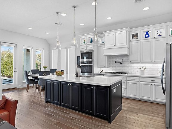 Inside, discover a light-filled open design crafted for modern living. Gourmet kitchen features white cabinetry with hardware, quartz counters, a big island, pendant lighting, a five-burner cooktop with pot filler & double-stacked upper cabinets with glass inserts to the ceiling. Stainless steel appliances, a quiet dishwasher, rollout trash drawer, recessed lighting, and a generous pantry. Wood-look tile flooring flows thru entry, kitchen & family room centered around a switch-operated cast stone gas fireplace.