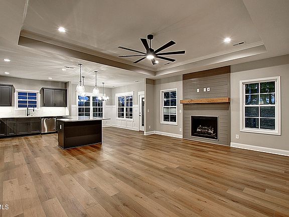 Large family roomMaintenance free lvp flooringOpen concept homeShiplap natural gas fireplaceLarge walk-in closetLarge barCovered deck