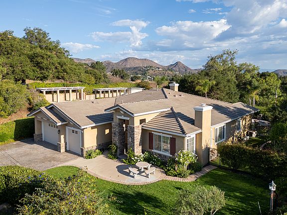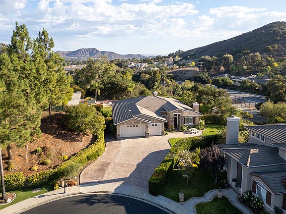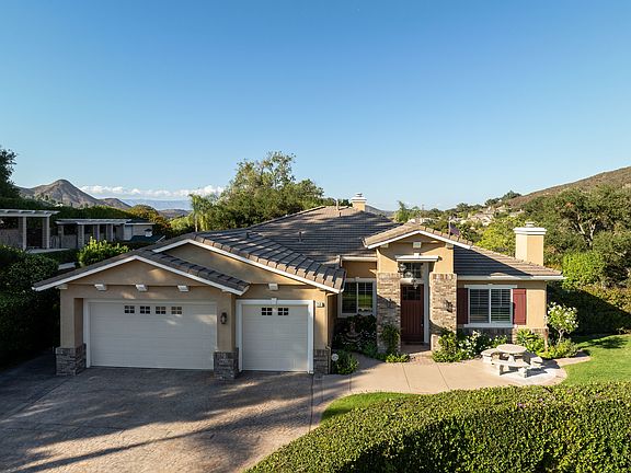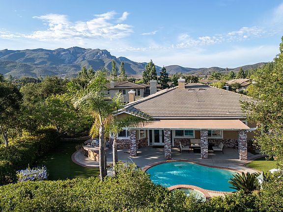Outdoors, enjoy California living at its finest with a sparkling pool and bubbling spa, BBQ center with seating bar, and a serene setting in the shade of a majestic grand oak and swaying palm trees. An upper tier showcases spectacular Mt. Boney views. Practical touches include three built-in sheds with locking doors to hold all your toys and make organization effortless. A spacious three-car garage and an oversized stamped concrete driveway enhances the home's wonderful curb appeal.