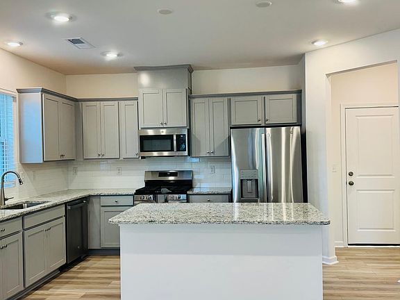 The kitchen includes an eat-at island with a sink, stainless steel appliances, beautiful cabinets, backsplash, and gorgeous, speckled countertops. A corner pantry will help keep your favorite snacks and canned goods organized.