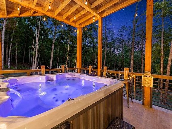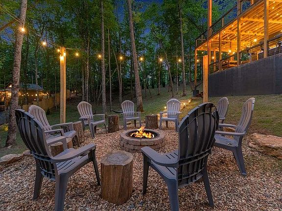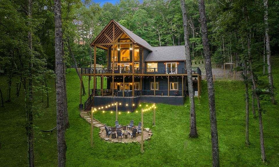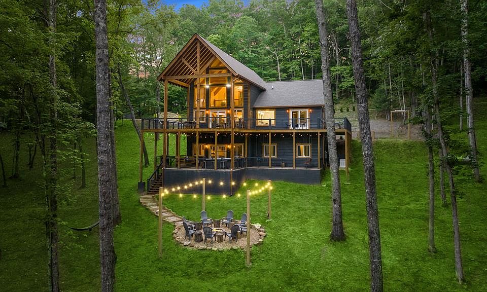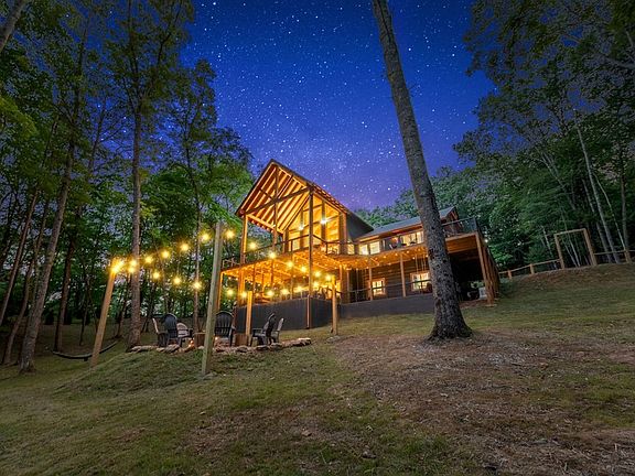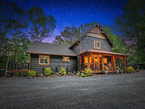Set amid the tranquil beauty of Blue Ridge, this extraordinary retreat captures the perfect harmony of luxury, serenity, and proven investment performance. Positioned on private 1.32-acres, the 4,230-square-foot residence is a true statement of refined mountain living—where exceptional craftsmanship meets breathtaking natural surroundings. Inside, sophistication unfolds across five spacious bedrooms and four beautifully appointed bathrooms. The great room impresses with soaring 30-foot ceilings and a dramatic wall of glass, filling the space with natural light and framing sweeping mountain vistas. A striking gas fireplace brings warmth and understated elegance, creating a welcoming setting for both intimate moments and grand gatherings. The chef's kitchen is designed for effortless entertaining, flowing seamlessly into the open living area and out to the expansive wrap-around porch. It's the perfect place to dine al fresco, take in the crisp mountain air, or simply enjoy the serenity that defines this remarkable home. Every detail reflects intention and excellence—from the 25-kilowatt propane generator and premium water filtration system to the impeccable finishes found throughout. The lower level offers a private entertainment haven complete with a stylish game room, fully equipped fitness area, and direct access to a relaxing hot tub and unique outdoor bed—an ideal spot for stargazing beneath the mountain sky. Outside, the experience continues with a grand fire pit, swaying hammocks, and the modern convenience of a Level 2 EV Charger. Beyond its stunning design, this property stands as an exceptional investment opportunity, boasting a 2025 gross rental income of 136k+!