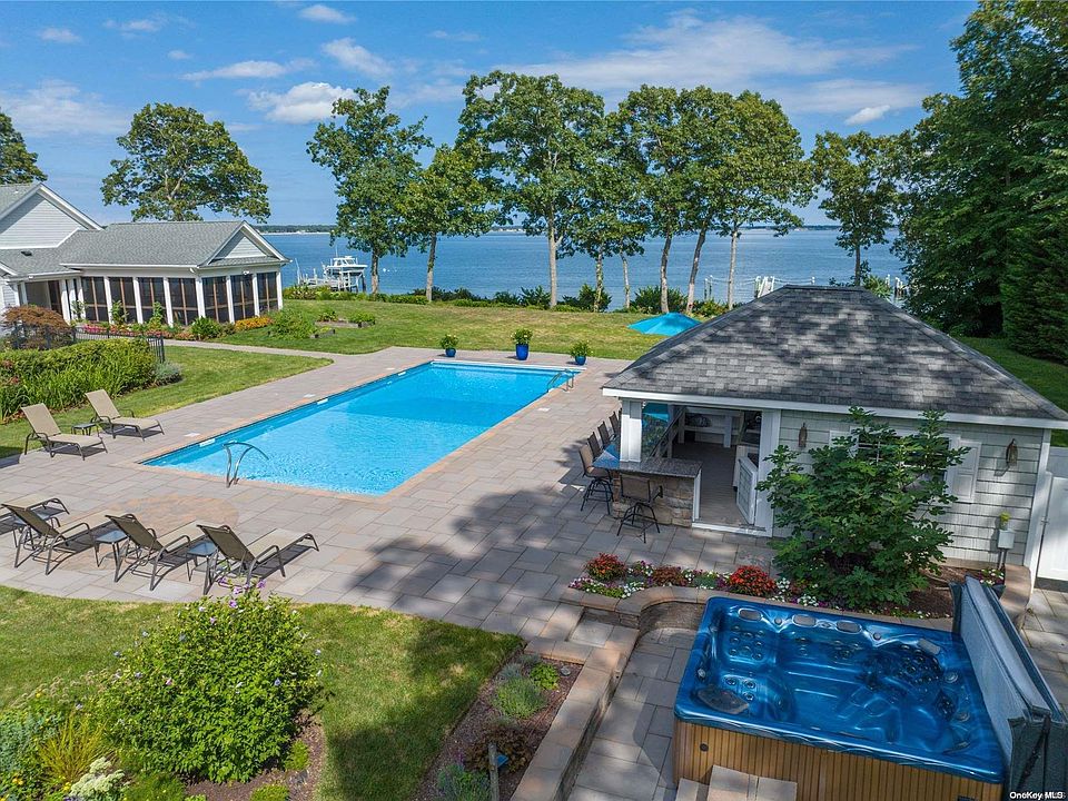 Paradise Point Road is one of the most prestigious addresses on the North Fork. This stunning home sits on 3.28 acres, has 252 ft of waterfront on the bay with its own sandy beach, newly built dock, and more! Privacy abounds with an electric entrance gate with telecom followed by a long tree lined driveway to this 5 bedroom, 6 bath home. All 5 bedrooms have ensuite baths, the primary bedroom overlooks the water with doors leading out to an expansive backyard. When you enter the home, the first thing you see is the bay! The foyer opens into a serene sitting room with floor to ceiling glass doors and panoramic water views. The great room includes an impressive stone fireplace which is easily controlled by remote for an instant gas flame. Also included in the great room is a new wet bar with ice maker, wine-fridge, sink and wine rack perfect for entertaining! The kitchen and dining areas both overlook the water with doors to the outdoor space and to a magnificent screened-in porch that has ample space for large gatherings. The outdoor space is an entertainer's paradise, with outdoor speakers, a spacious bluestone patio equipped for a large dining table, a heated saltwater pool with an automatic pool cover, separate hot tub, pool house with wet bar, outdoor shower, gas firepit and beach cabana/boat house equipped electric and water. Smart technology throughout the home. Generac generator with cellular monitoring device. This home has been fully upgraded over the last 10 years including electric, insulation, etc. Too many upgrades to list. Must be seen in person to truly appreciate!, Additional information: Appearance:Mint,Interior Features:Marble Bath,Separate Hotwater Heater:Y