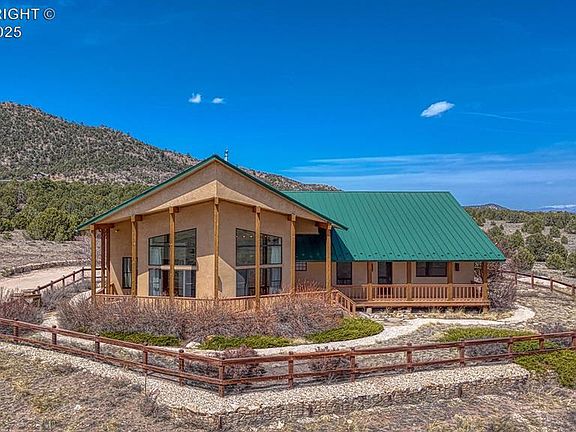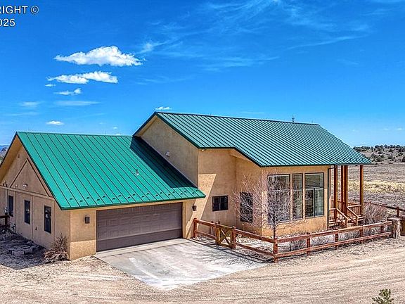 Experience the ultimate blend of luxury, comfort, and Colorado mountain living in this impeccably designed custom home nestled on 42.69 pristine acres in the exclusive, gated community of Beckwith Mountain Ranch. With privacy, serenity, and breathtaking scenery at every turn, this 3-bedroom, 2-bath home is a true sanctuary for those who appreciate refined living in harmony with nature. Constructed with energy-efficient ICF for superior insulation and durability, the home is thoughtfully powered by electric, solar, and a backup generator—ensuring peace of mind and sustainability year-round. Radiant in-floor heating spans the entire home, creating an inviting atmosphere in every season. The home offers exquisite Maple cabinetry, durable and elegant Silestone quartz countertops, and custom built-ins throughout. Highlights include a cleverly integrated Murphy bed, a chef’s pantry, high-end stainless appliances, and low-maintenance tile flooring that enhances the home’s effortless livability. Large windows frame uninterrupted views of the Sangre de Cristo Mountains. The spacious primary suite offers direct access to the walk-around covered Trex deck—perfect for peaceful mornings or stargazing nights. The en suite bath features dual vanities, towel warmers for a touch of spa-like indulgence, and private access to the serene back covered patio. An oversized 4-car garage provides ample space for vehicles, outdoor toys, and a workshop, making it easy to pursue hobbies or store gear for year-round adventures. The expansive acreage surrounding the home invites exploration, relaxation, and the freedom to enjoy your land however you choose—whether for horses, gardening, or simply soaking in the peace of nature. From modern comforts and top-tier craftsmanship to its remarkable setting in one of Colorado’s most scenic communities, this home checks every box for those seeking quality, tranquility, and connection to the outdoors. Schedule your private tour today!