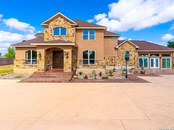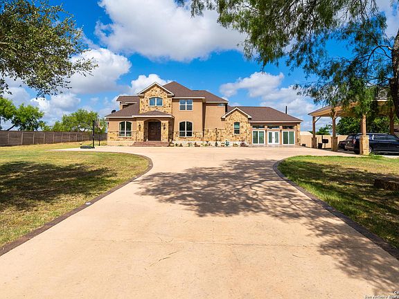 Nestled in the quiet and serene community of Lytle, this stunning 4-bedroom, 5-bathroom home is ready for you to move in! As soon as you step inside, the high ceilings and natural light will take your breath away, creating a bright and cheerful atmosphere. The open floor concept, perfect for entertaining guests, provides ample space while bringing together the living, kitchen, and dining areas seamlessly. Each bedroom in this magnificent home boasts its own bathroom with walk-in closets, providing a private retreat from the rest of the house. If you love to cook, the chef's kitchen is a dream come true, featuring top-of-the-line appliances, and a spacious island for meal preparations. Enjoy recently painted bright white cabinets with quarts countertops and new backsplash! The family room is the perfect space to relax after a long day, with a beautiful electric fireplace adding a touch of warmth and comfort with great views to the exquisite pool. Adore the custom roman shades to open and close at your connivence for natural light or darkness to preserve energy. Need a space to work or study? Look no further than the study, conveniently located downstairs. The master bedroom suite is located downstairs, along with an additional bedroom, allowing for flexible living arrangements. Head upstairs and you'll find a game room, perfect for movie nights or game nights. Additionally, this stunning home offers an outdoor oasis, a heated pool, hot tub and pool house-all custom features that could be yours! For the outdoor lover, appreciate the concrete courtyard area, an outdoor fireplace to sit 10 easily and adore the open grill and and a propane grill under cabana! Not to mention ample attic space for storage, a small storage room built out back to match the home and a three car metal building/workshop equipped with electricity. There is a space for everyone in the family in this attractive slice of Texas heaven. Your privacy and peace of mind are a top priority in this cozy neighborhood, with an electric fence to enter the property and a 40ft x 40ft covered carport with RV hookup. Built in 2016, this home offers the perfect balance of modern conveniences and comforts with a touch of Southern charm. Situated on 1.84 acres, take advantage of the tranquil and expansive yard, graced with mature trees and lush greenery. Don't miss your chance to call this beautiful property your new home!