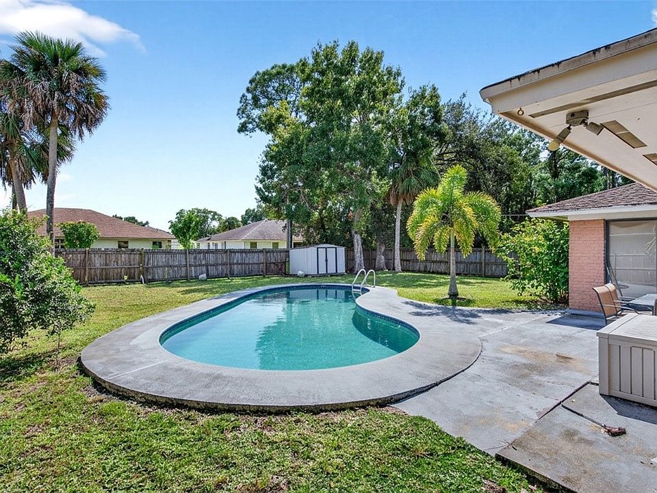 Your pool paradise awaits! This cute, clean, and well-maintained 3-bed, 2-bath home is in the Heart of Port St. Lucie, and with NO HOA! The open floor plan boasts large ceramic tile flooring that flows seamlessly throughout the entire home, making maintenance a breeze. The living room has a cozy built-in fireplace. The kitchen shines with stainless steel appliances, white cabinets, and an eat-in breakfast bar. The best part? Your own private, tropical oasis! The oversized backyard is fully fenced for privacy and features a sparkling pool and a storage shed. Schedule your showing today!