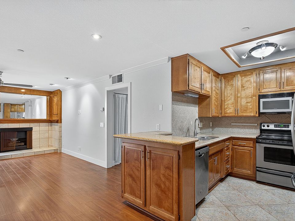 Corner unitCozy fireplaceOpen layoutLarge private patioGranite countertopsIn-unit washer and dryerWood and tile flooring